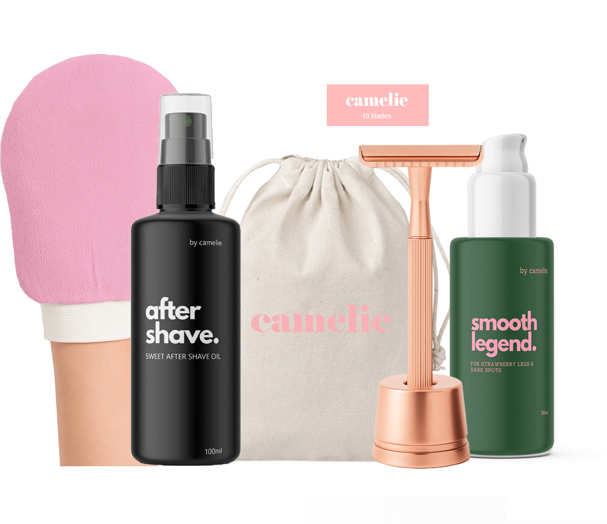 Shaving with the Camelie razor helps reduce skin irritation, razor bumps, and ingrown hairs—common issues with disposable razors. The key benefit is that with the Camelie razor, only one high-quality blade touches your skin at a time, offering a precise and smooth shave.
